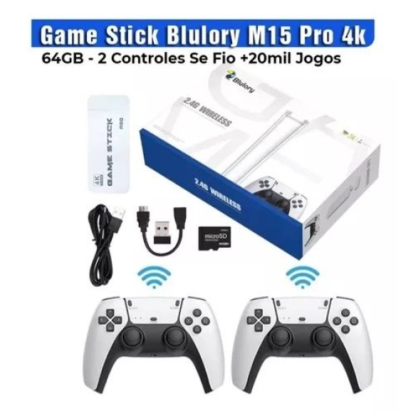 Experimente a impressionante qualidade de imagem 4K, juntamente com 2 controles sem fio de 2.4GHz para multijogador sem fio. Aproveite as horas intermináveis de diversão com o Blulory M15! Caracteristicas: Nome: M15 Pro Game Stick 4K Processador: GB2 Cortex-a7 1.0 GHZ de núcleo duplo Memória DDRIII 256M Sistema: Sistema de fonte aberta Emuelec4.3, expansão de cartão TF de suporte, Max 128GB, suporte para baixar jogos de formatos relacionados, suporte mais grandes jogos 3D. Jogos de 64GB (20000+ Jogos) PSP,PS1,N64,CP1,CP2,CP3,Neogeo,GBX,MAME, FC.FCE,SFC,GB.GBA.GBC.MDNGPC,MEGADRIVE,GAMEGEAR,SEGA GENESIS, e outros simuladores